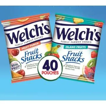 Show more Introducing the delectable and delightful **Welch's Fruit Snacks Variety Pack**, a treat that brings joy to snacking while prioritizing health. Each pack contains **40 individual 0.8 oz servings**, making it an ideal choice for families on the go. The first ingredient in these fruit snacks is real fruit, ensuring that every bite is bursting with flavor. With a perfect blend of fruity goodness, these snacks are enriched with a blend of important vitamins, including Vitamins **A**, **C**, and **E**. That's not all! Welch's snacks are both gluten-free and fat-free, providing a guilt-free indulgence for everyone.