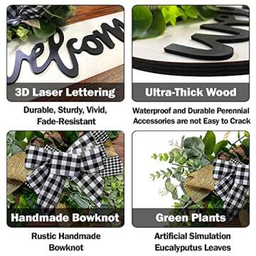 Show moreWelcome guests into your home with the exquisite **Oscenlife Welcome Sign for Front Door**. This rustic yet modern piece of decor is meticulously designed by a professional team, ensuring that it leaves a lasting impression on anyone who arrives. Unlike many other welcome signs on the market that feature cheap and flimsy materials, our sign boasts life-like eucalyptus leaves adorned with delightful flowers, designed to look fresh and vibrant throughout the seasons. The sturdy plaid bow is securely stapled onto the wooden wreath, eliminating worries of detachment over time. Not only does this piece greet your visitors warmly, but it also acts as a stunning decoration that enhances the beauty of any space.