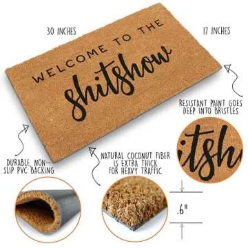 Show moreWelcome your guests in style with the Welcome to the Shitshow Doormat, a hilarious addition to any front door that is sure to spark laughter and set a light-hearted tone. Measuring 30x17 inches, this outdoor mat seamlessly blends functionality with a humorous twist, making it a must-have for those who love to entertain. Constructed from 100% durable coir fibers, this doormat is built to withstand the rigors of outdoor use while maintaining its striking aesthetics. The phrase is embedded in the fibers, ensuring it won't fade away quickly, no matter how often it graces your doorstep.