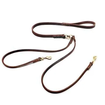 Wellbro Real Leather Double Dog Leash, No Tangle Dual Dog Leashes with Heavy Duty Shiny Coupler, 5 Feet Pet Training and Walking Leads for 2 Puppies, Small and Medium Dogs, Brown