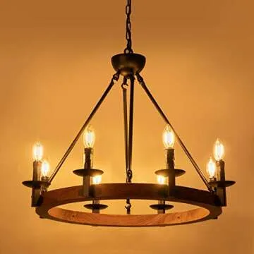 Wellmet 8 Lights Farmhouse Iron Chandeliers for Dining Rooms 28 inch, Wagon Wheel Chandelier Candle Style, Rustic Hanging Ceiling Light Fixture Bedroom Living Room Foyer Hallway, Faux Wood Finish