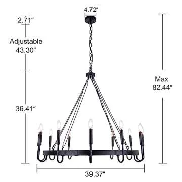 Show more The Wellmet Matte Black Wagon Wheel Chandelier is a stunning addition to any space, embodying both elegance and a modern aesthetic. Crafted with a distinctive matte black finish, this chandelier features a unique wagon wheel shape, providing a remarkable focal point that commands attention. With its generous dimensions of 39.37 inches in length and width, and a height of 36.41 inches, this piece is versatile enough to enhance larger rooms while also creating an intimate atmosphere in smaller living areas.