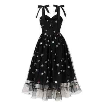 Show moreStep into the spotlight with the Wellwits Women's Star Sequin Mesh Bow Tie Vintage Formal Dress in Gothic Black. This stunning piece is designed to turn heads, featuring a flattering sweetheart neckline that beautifully enhances your décolletage for an elegant look perfect for formal occasions. The combination of star sequins and a delicate mesh overlay not only adds glamour and shine but also creates a mesmerizing effect that will leave everyone in awe. Made for those who love to stand out, this dress is tailored for comfort and impact, ensuring you feel as fabulous as you look.