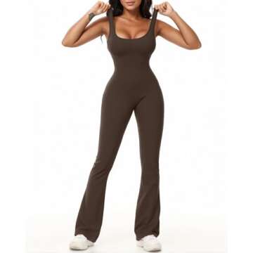 Show more Introducing the Wenlia Women's Workout Flare Jumpsuit, a standout piece that combines style, comfort, and functionality. Crafted from premium fabric, this workout jumpsuit is designed for the modern woman who loves to blend fitness with fashion. Its moisture-wicking, soft, and breathable properties ensure you stay cool and dry during rigorous workout sessions. The fabric's stretchability allows for unrestricted movement, perfectly contouring your body and ensuring maximum comfort, making you the center of attention while you crush your goals.