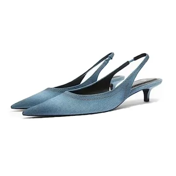 Show more Step into style with the WENOREG Women's Pointed Toe Slingback Kitten Heels, where comfort meets elegance. Crafted with a skin-friendly denim upper, these shoes ensure that your feet not only look fabulous but feel fantastic too. The classic pointed toe design adds a sophisticated touch while elongating the legs for a graceful silhouette. The 2-inch kitten heel strikes the perfect balance between height and comfort, making it ideal for daily wear or special occasions. Equipped with elastic back straps, these slip-on shoes offer a snug fit that adjusts to your foot, granting you custom support for all-day wear.