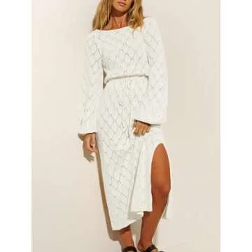 Wenrine Women's Fall Long Sleeve Sweater Dress - Elegant Diamond Crochet Knit Midi Dress in White