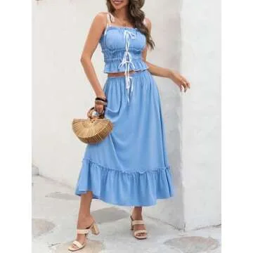 Wenrine Women's Summer 2 Piece Skirt Sets Casual Spaghetti Straps Cropped Cami Ruffle Maxi Skirt Flowy Beach Outfit