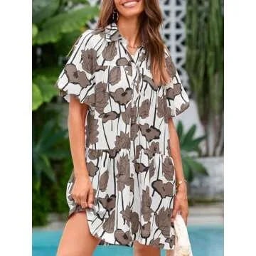 Wenrine Women's Summer Button Down Shirt Dress Floral Puff Short Sleeve Casual Loose Fit Beach Mini Dresses Brown