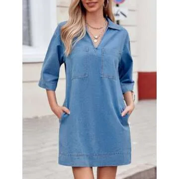Wenrine Womens Denim Shirt Dress Summer Casual V Neck Short Sleeve Loose Jean Mini Dresses Light Blue