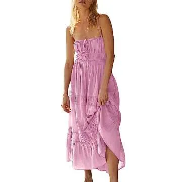 Show more Step into summer with the Wenrine Women's Summer Beach Dress, your ultimate companion for sun-drenched days and starry nights. This enchanting maxi dress showcases a captivating open back design, accentuated with delicate spaghetti straps that embrace your shoulders and add elegance to your silhouette. The high waist and smocked details not only provide a comfortable fit but also allow for an effortlessly chic appearance. The tiered long skirt billows with grace, ensuring you look stunning and feel confident no matter the occasion.