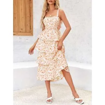 Wenrine Womens Summer Floral Maxi Dress Sleeveless Spaghetti Strap Tie Back Tiered Ruffle Dresses Orange