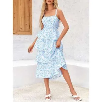 Wenrine Womens Summer Floral Maxi Dress Sleeveless Spaghetti Strap Tie Back Tiered Ruffle Dresses Blue