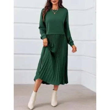 Wenrine Womens Sweatshirt Dress Casual Patchwork Long Sleeve Crewneck Pleated Fall Maxi Dresses Dark Green