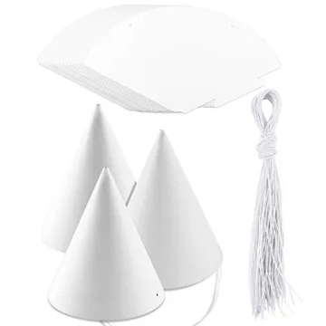 Show more Introducing the ultimate party essential that combines creativity and fun—the White Party Hats DIY Set! This set includes 40 pieces of pristine white party hats, made from high-quality cardstock paper that is not only sturdy but also durable for long-lasting use.