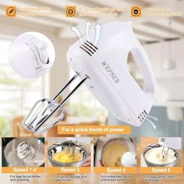 Show more Introducing the ultimate Electric Handheld Mixer and kitchen essentials set, designed to elevate your cooking and baking experience! With a powerful 200 Watt motor and 5 adjustable speeds, this lightweight handheld mixer allows you to find the perfect speed for every mixing task. No more messes or spills—a gradual speed increase ensures optimal mixing consistency every time. The kitchen mixer comes with a comprehensive set of attachments: 2 stainless steel beaters, 2 balloon whisks, and 2 dough hooks. Plus, they are all dishwasher-safe and easily removable with a press button for seamless use.