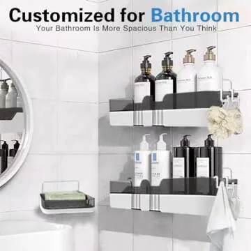 Show more Transform your bathroom into a haven of organization and style with this exceptional bathroom organizer set. Made from high-quality ABS materials, this package includes everything you need: 2 bathroom organizers, a soap dish, adhesives, and hooks. Unlike ordinary organizers, our product features a double-layer circular hole drain design at the bottom. This unique design promotes ventilation, ensuring your bathroom shelves remain dry and clean, enhancing your overall experience.