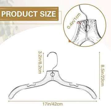 Show more Discover the perfect blend of style and functionality with our premium Clothes Hanger Set. This set includes 60 pieces of thick, resilient hangers measuring 17 inches each, designed for daily use and sharing needs. Crafted from sturdy clear plastic, these hangers ensure your clothes are held securely, maintaining their shape and quality for years. Unlike flimsy alternatives, these hangers provide impressive support, making them ideal for anything from delicate silk dresses to heavy winter coats.