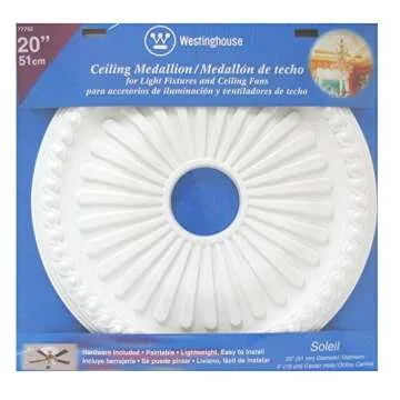 Show moreTransform your ceiling into a masterpiece with the Westinghouse 7775200 Soleil Polyurethane Ceiling Medallion. This elegant 20-inch decorative medallion is designed to enhance the aesthetic of your ceiling fan or lighting fixture while adding a touch of sophistication to your space. Crafted from lightweight and sturdy polyurethane, this medallion beautifully replicates the look of traditional plaster styles without the drawbacks. Unlike cheaper alternatives, it won’t warp, splinter, or split, ensuring that it retains its beauty over time.