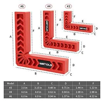 Show more The WETOLS Right Angle Clamp Squares are incredibly essential tools for any woodworking enthusiast or professional carpenter. Crafted with high-strength engineering plastics, these clamps offer superior durability and are significantly lighter than competing products on the market. This set includes 12 versatile positioning squares in sizes of 3, 4, and 6 inches, making it perfect for a range of wood thicknesses and project requirements.