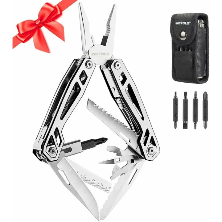 Show more The WETOLS Multitool Needle Nose Pliers is an essential 21-in-1 stainless steel multi-tool that combines practical design and robust construction in a compact format. Perfect for outdoor enthusiasts, DIY lovers, and handymen, this multi-tool includes a variety of tools like a pocket knife, screwdriver sleeve, self-locking survival knife, and EDC pouch. The solid metal construction, large-handled pliers, and secure locking mechanisms make it safe and easy to use. With its carefully designed features, it is built to withstand heavy use and provide reliable performance, all at an incredible value under $25.