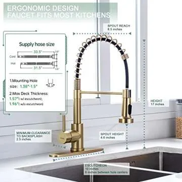 Show more Your kitchen is the heart of your home, and the perfect kitchen faucet can make all the difference. Introducing the sleek and stylish brushed gold kitchen faucet from WEWE, designed with both function and aesthetics in mind. This impressive utility faucet is crafted to elevate your cooking and cleaning experience. With its compact 17’’ height, it fits effortlessly under most cabinets, ensuring you don’t have to compromise style for space.