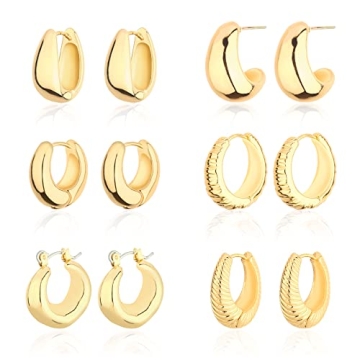 Wgoud Chunky Huggie Earring 14K Gold Hoop Earrings for Men Women Hypoallergenic, Thick Twist Earring (6 Prs Chunky Gold)