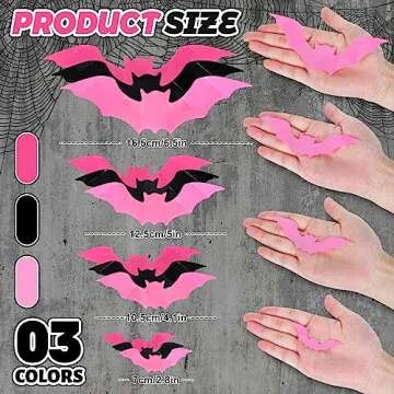 Show more Transform your home into a spine-tingling haunted haven this Halloween with the Whaline 112Pcs Halloween Wall Decoration 3D Bats! These enchanting bat stickers come in a delightful palette of black, rose red, and pink, perfect for creating a captivating atmosphere for ghouls and goblins alike. With 112 pieces at your disposal, including 32 black bats, 32 rose red bats, and 48 pink bats, you’ll have ample options to artfully arrange them and infuse your space with Halloween spirit. Made from premium waterproof PVC, these lightweight bat decals are designed to withstand the elements, allowing you to showcase your festive flair both indoors and outdoors. Each bat can be arranged to flutter in different wing angles, bringing your walls to life with dynamic decorations that are sure to wow your guests and trick-or-treaters!