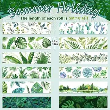 Whaline 12 Rolls Greenery Washi Tape Tropical Leaves Masking Tape 15mm Green Plants Cactus Succulents Summer Decorative Tape Sticker for Scrapbook Journal DIY Craft Gift Wrapping,16.4ft