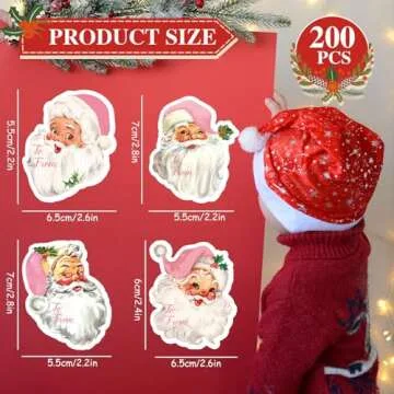 Whaline 200Pcs Pink Santa Claus Name Tag Stickers 10 Design Christmas Santa Gift Labels Xmas to & from Paper Gift Name Tag Stickers for Winter Holiday Birthday Gift Wrap Decor