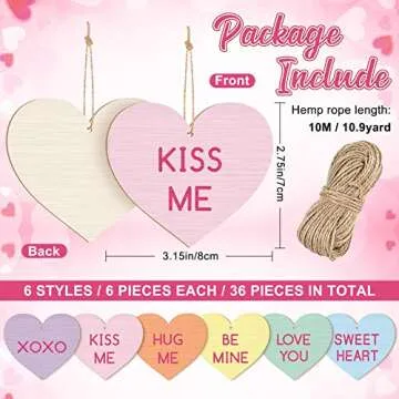Show more Introducing the Whaline 36Pcs Valentine's Day Wooden Hanging Ornaments - a delightful set of heart-shaped decorations that beautifully enhance any romantic occasion. Each ornament measures 8 x 7 cm (3.15 x 2.76 inches) and features a stunning candy-colored palette, including pastel pink, orange, yellow, green, blue, and purple. Designed with sweet words to inspire love and affection, these wooden embellishments come with a 10m (10.9 yard) jute hemp rope, offering ample length for your creative needs. Whether you adorn your home or craft unique gift bags, these ornaments promise to bring charm and warmth to your celebrations.