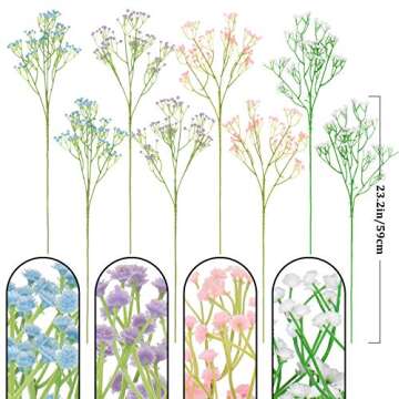 Show more Transform your living space into a botanical paradise with our exquisite Baby's Breath Bouquet set. This enchanting collection features 8 packs of stunning baby’s breath flower bouquets, crafted with a real touch texture that mimics the beauty of fresh flowers, making them an exceptional addition to any home or office decor. With a total of four vibrant colors—white, blue, pink, and purple—each color comes with two bouquets, bringing a burst of color and charm that elevates your surroundings.