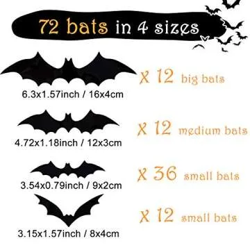 Show moreTransform your home into a spooky haven this Halloween with the Whaline 72 Pack 3D Bats Stickers! Crafted from high-quality waterproof PVC, these striking bat decals are designed to elevate your decor with their sleek black finish and realistic appearance. Featuring a variety of sizes, including 12 big bats (16 x 4 cm), 12 medium bats (12 x 3 cm), and 48 small bats (9 x 2 cm & 8 x 4 cm), you can create a captivating Halloween scene perfect for any wall, door, or window. Easy to apply and remove, these bats will stick around without damaging your surfaces, making them a top choice for festive decorations!