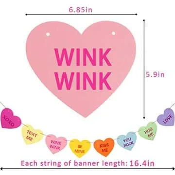 Show moreTransform your Valentine's Day celebrations with the Whaline Valentine's Day Conversation Heart Banner! This delightful decoration adds a sweet touch to any romantic occasion, featuring 32 vibrant hearts in candy colors suspended across two generous strings. Each heart, measuring approximately 5.9 x 6.85 inches, carries charming and iconic sayings like "XOXO", "KISS ME", and "BE MINE", celebrating love in style. With a total length of 32.8 feet, it effortlessly enhances your party atmosphere, making it ideal for hanging on walls, doorways, or from the ceiling, wherever you desire a colorful splash of whimsy.
