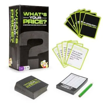 Show more If you're on the hunt for the ultimate party game that guarantees laughter and endless fun, What's Your Price? is the perfect choice. This engaging and hilarious twist on traditional party games will elevate your game night to new heights. With an impressive selection of 280 unique scenario cards and 80 money cards, players are challenged to ponder, debate, and declare what price they'd accept to perform a multitude of entertaining and often outrageous challenges. This dynamic game is not just about the scenarios but about the lively conversations and surprising insights shared among friends and family.
