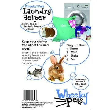 Show moreIntroducing the Wheeky Pets Laundry Helper, a revolutionary laundry bag that is specially designed for pet owners who want to keep their washing machines clean and their pet laundry in pristine condition. This bag is not just any ordinary laundry bag; it accommodates a variety of pet items, including fleece for C&C cages, Midwest cage liners, cuddly beds, blankets, and towels for your beloved guinea pigs, rabbits, and other small pets. With its eco-friendly green and white design, it not only serves a practical purpose but also adds a touch of style to your laundry routine. Measuring 29 inches wide and 31 inches long, it boasts a spacious capacity that can comfortably hold the essentials for multiple small pets while ensuring a hassle-free wash every time.