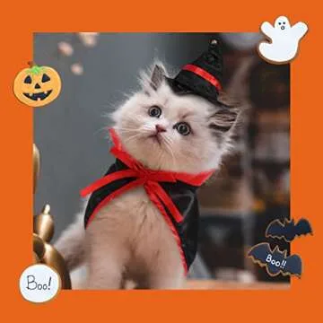 Show more Get your furry friend ready for a spooky, stylish celebration with the WHIPPY Halloween Cat Costume. This enchanting vampire cloak paired with a classic bowler hat is crafted to enhance your pet's charm, making them the center of attention this Halloween. Designed with a playful spirit in mind, the hat features an elastic band and a cute pig nose button, enabling easy adjustments to fit pets of various sizes. With a delightful little bell attached, your pet will not only look adorable but will also add a musical jingle to their Halloween fun!