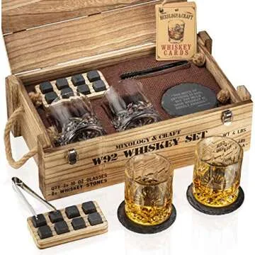Show more Introducing the ultimate gift for whiskey enthusiasts: a luxurious whiskey gift set that encompasses everything from functional elegance to charming vintage aesthetics. This sophisticated whiskey crate is not just a container; it’s an experience, meticulously crafted by skilled artisans to combine practicality with style. Inside this handsome vintage-style ammunition crate, you’ll discover two 10oz lead-free rocks glasses designed to perfectly complement your favorite spirit, along with eight natural granite whiskey stones that cool your drink without diluting its exquisite flavors. A custom-fit wood tray for storing the stones keeps the set organized and appealing.