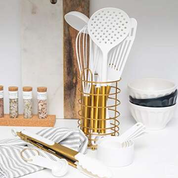 The elegant white and gold design is not just eye-catching; it's a great addition to any kitchen decor. Whether you're a novice cook or a seasoned professional, this set will elevate your cooking experience while keeping your kitchen organized and stylish with its matching gold utensil holder.