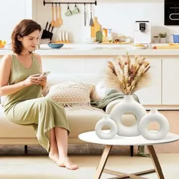 Show more Introducing the stunning hollow design white ceramic vases, a perfect fusion of elegance and modern aesthetics, bringing a refreshing change to your home décor. Shaped like a donut, these vases are no ordinary flower holders; they are a statement piece that elegantly showcases the beauty of flowers while letting light filter through their unique hollow structure. Crafted with meticulous care, these vases are designed to enhance your living spaces with a touch of romance and style.