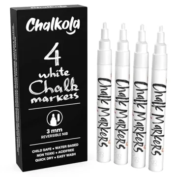 Introducing the White Chalk Markers Fine Tip (4 Pack 3mm) by Chalkola, a versatile set designed to unleash your creativity! These innovative markers feature a dual-purpose design with a reversible bullet and chisel point, making them perfect for a variety of applications. Whether you’re chalking up vibrant messages on blackboards or adding a personal touch to your café's menu, these markers provide an effortless solution. Crafted for mess-free use, they are non-toxic and safe for both...