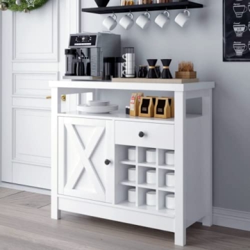 Show moreElevate your coffee experience with our White Coffee Bar Cabinet, a stylish fusion of modern and farmhouse aesthetics that will enhance any kitchen or dining room. This exquisite coffee station cabinet features a charming white finish paired with a rustic barn-door design, perfectly capturing the essence of contemporary farmhouse decor. With its multifunctional approach, this cabinet serves not only as a coffee station but also as a wine bar, making it an essential addition for coffee enthusiasts and entertaining hosts alike.