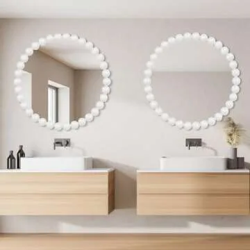 Show more Enhance your living spaces with our stunning, modern decorative round mirror that captures the essence of chic sophistication. This exquisite white round wall mirror is designed to be a statement piece, boasting a unique beaded wood frame with a sophisticated satin finish. Measuring a perfect 24 inches in diameter, it serves not just as a functional accessory, but also as a striking piece of home decor.