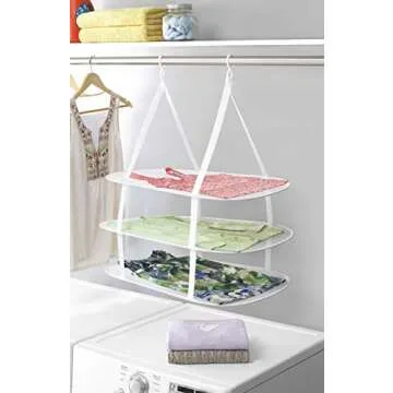 Heavy-duty hanging straps and durable hooks. Hangs on closet or shower rod.