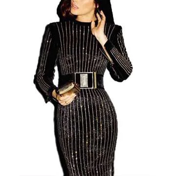 whoinshop Women's High Neck Long Sleeves Rhinestone Midi Evening Bandage Elegant Dress (L, Black)