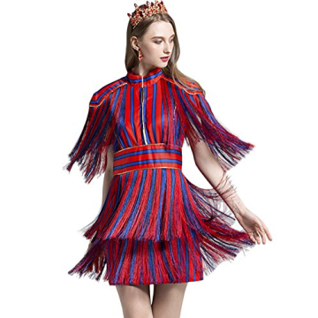 Whoinshop Women's High Neck Short Sleeve Tassel Stripe Club Party Bodycon Mini Dress Red M