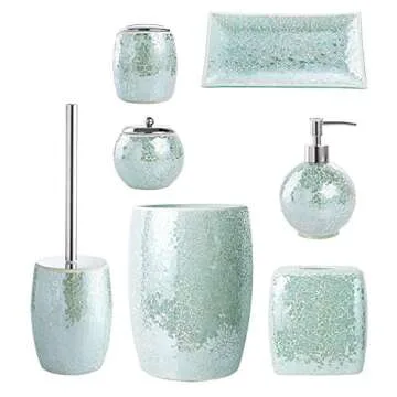 Show more Introducing the Whole HOUSEWARES Bathroom Accessory Set, a stunning 4-piece collection that seamlessly combines functionality with luxury, transforming your daily routine into a sophisticated experience. This set includes a soap dispenser, a toothbrush holder, a cotton jar, and a vanity tray, each designed to elevate your bathroom’s aesthetic. The vibrant turquoise mosaic finish not only adds a pop of color but also conveys a chic, coastal vibe that aligns perfectly with modern and mermaid-themed decor.