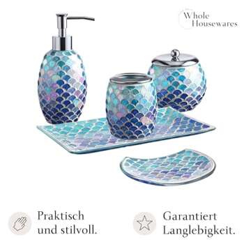 Whole HOUSEWARES Bathroom Accessory Set - 5-Piece Decorative Glass Bathroom Accessories Set with Mosaic Glass Finish - Bath Room Set Includes Soap Dispenser, Tray, Jar, Toothbrush Holder - Blue