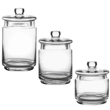 Show more Introducing the WHOLE HOUSEWARES Glass Apothecary Jars with Lids - an elegant set of three beautifully designed jars that combine style with practicality, making them an essential addition to your home organization toolkit. Perfectly sized, these jars are neither too big nor too small, ideal for storing your bathroom essentials, from q-tips to cotton swabs and cosmetic pads. The attractively crafted lids, featuring airtight rubber gaskets, ensure your items remain dust-free while adding a touch of sophistication to your decor. Whether used in your bathroom, kitchen, or dressing table, this versatile set elevates any space with both charm and function.