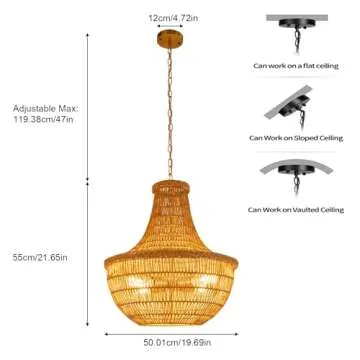 Wicker Rattan Chandelier Hand-Woven Pendant Light Farmhouse Rustic Hanging Ceiling Lamp Fixture Adjustable Height for Living Room Bedroom Dining Room