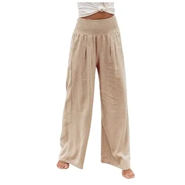 Show more Step into comfort and style with our Wide Leg Pants for Women. Designed for all-day wear, these elastic high waist palazzo lounge pants blend practicality with fashion. Made from a lightweight cotton linen blend, these trousers offer breathability and ease of movement, making them perfect for everything from casual outings to yoga sessions. The relaxed fit and wide legs provide a fashionable silhouette that suits a variety of occasions, while the smocked waistband ensures a comfortable and adjustable fit.